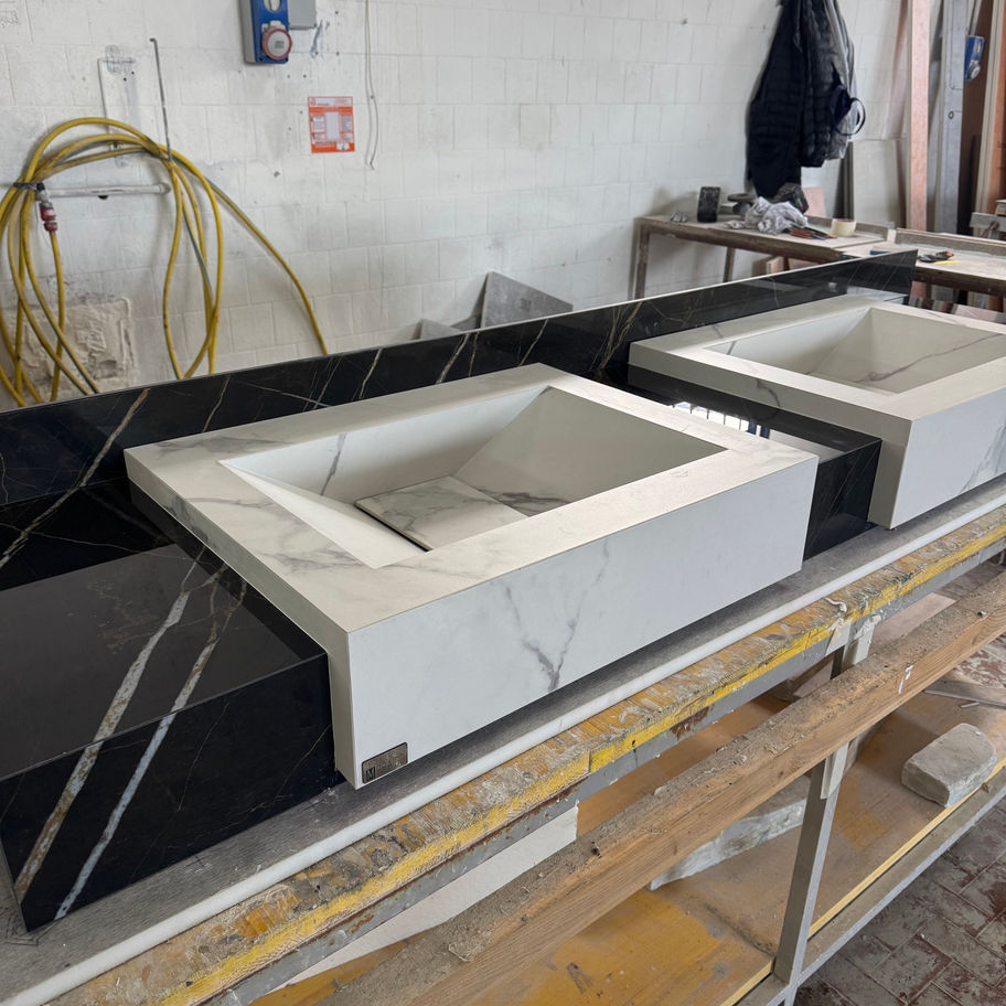 Eleva il design del tuo ambiente bagno con questo top esclusivo da 200 cm, un perfetto connubio tra estetica scultorea e tecnologia ceramica avanzata. Realizzato artigianalmente, questo pezzo unico gioca sul sofisticato contrasto cromatico tra il nero profondo venato e il bianco statuario purissimo.
